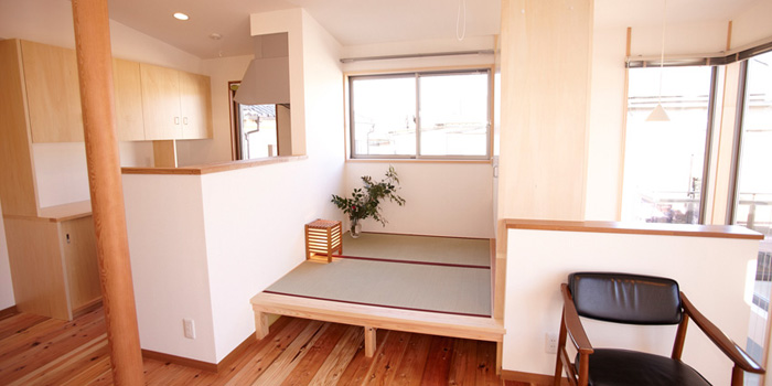住宅密集地にある敷地面積28.63坪に建設した一人暮らしの女性のための家である。 施主のライフスタイルに合わせ、仕立てた被服のようにフィットした「小さく住まう家」は、 住人の心と暮らしを豊かにする。ワンフロアで生活の主要な行動全てがまかなえる動線や機能面と、 外へ、空へ向かう視線の「ぬけ」を並存させ、 視線を遮らない開放的で清々しい空間の実現にも腐心した。