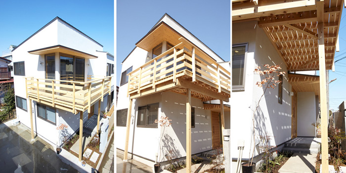 周りを住宅に囲まれた狭小地に建つ家である。 一番のこだわりは、道からすぐに玄関へ向かうアプローチを設けず、 あえて遠回りして歩かせるアプローチを設けたことである。 狭小地であるがゆえに庭を設けることができず、 この玄関までのアプローチに植栽を楽しむ庭の機能を持たせ、暮らしに癒しやゆとりを添えた。